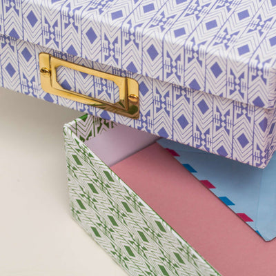 Paper backed board with acid free paper. Fitted with a frontal brass card frame and a 30 mm lift-off lid. Handmade in the UK.