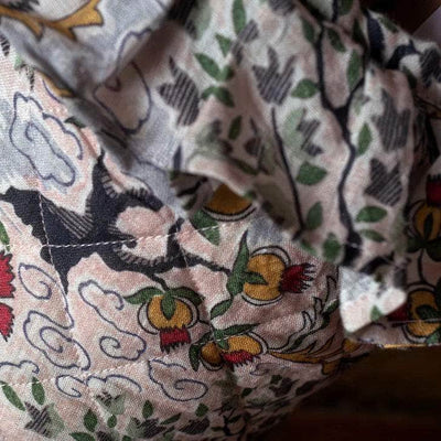 This vintage French textile design originally created in 1929 is truly alive with symbolism & good fortune. This fabric is  illustrating nature’s playground, decorates the tree of life motif with an abundance of pomegranates, flowers, animals & clouds.
