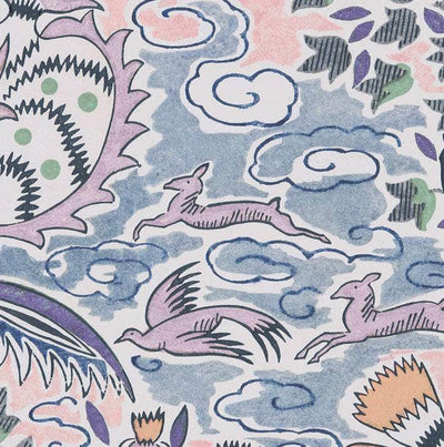 This vintage French textile design originally created in 1929 is truly alive with symbolism & good fortune. This wallpaper illustrating nature’s playground, decorates the tree of life motif with an abundance of pomegranates, flowers, animals & clouds.