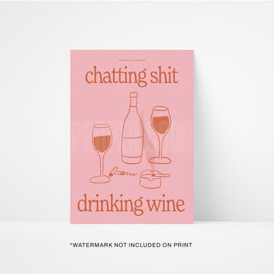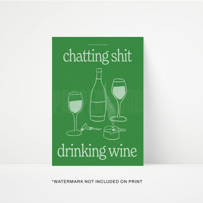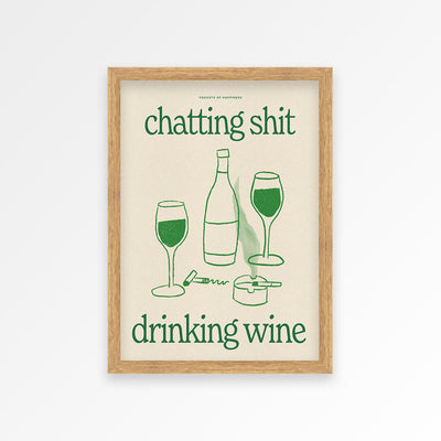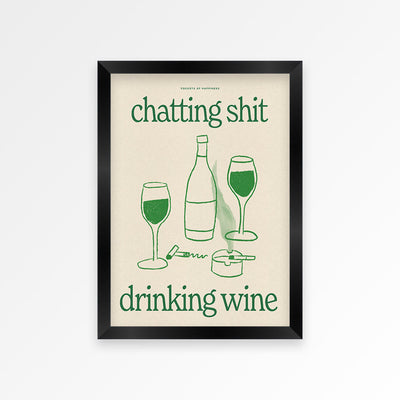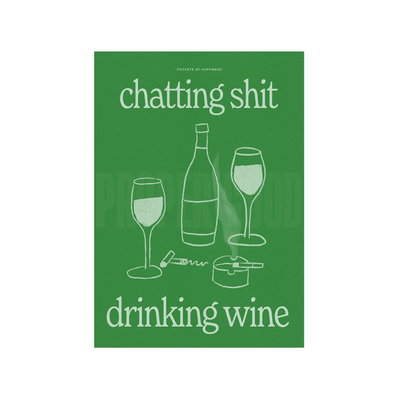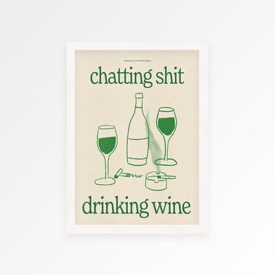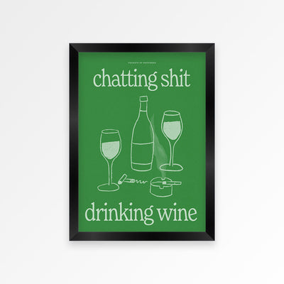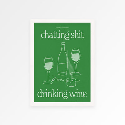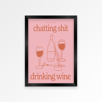 Get ready to elevate your space with a touch of humour and the "Chatting Shit, Drinking Wine" art print. Featuring a hand-drawn illustration, this print captures the essence of laid-back conversations and gossips with your friends. Hang it up in your living room, kitchen, or wherever you gather with friends for a guaranteed conversation starter and a good laugh.