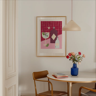 Introducing the "Pour Me Another" collection created from 4 hand collaged pieces of art. Muted tones run through the collection, with each still life piece designed within a polaroid-style border. Hang these artworks in your kitchen, dining area, or any space where you gather to enjoy good food and company.
