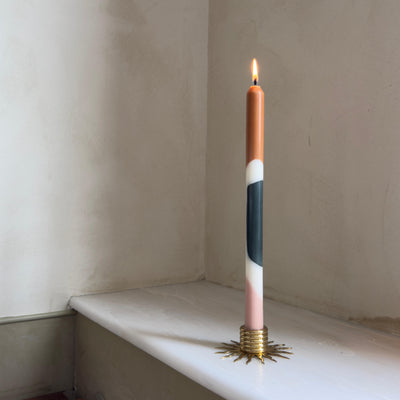 Pair of two dinner candles, hand-poured into unique colour blocks of off-white, brown, forest green and apricot vegetable wax.