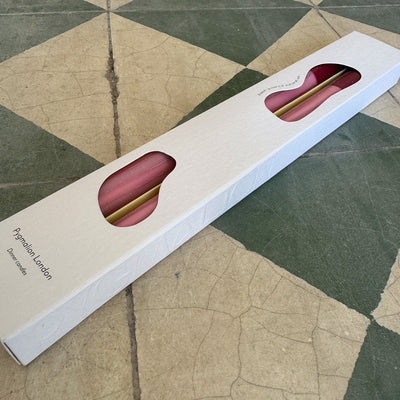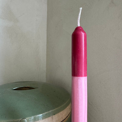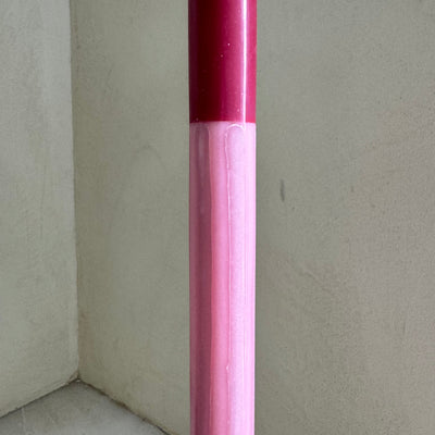 Pair of two dinner candles, hand-poured into loose stripes of dusky pink, pale pink and magenta wine vegetable wax.