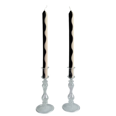 Pair of two dinner candles, hand-poured into waves of charcoal black and oyster vegetable wax.
