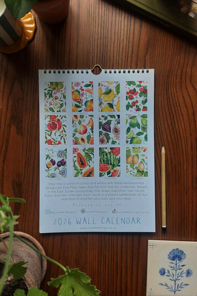 Step into a world of colour and whimsy with these hand-painted designs by Ellie Mae, taken from her Fruit Fine Art Collection. Each month is a playful celebration of fruit and flora to brighten your walls and days.