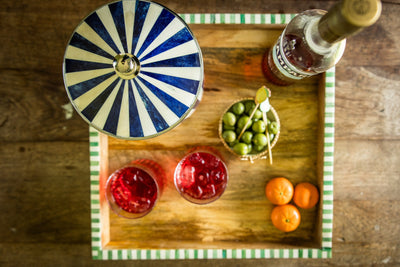 The ice buckets are handmade and every slither of bone inlay is dyed and then stuck on by hand to the mango wood base. Each piece of bone absorbs the dye in a slightly different way resulting in beautiful tonal variations. Therefore there will be occasional irregularities in every ice bucket adding to its individuality and uniqueness.