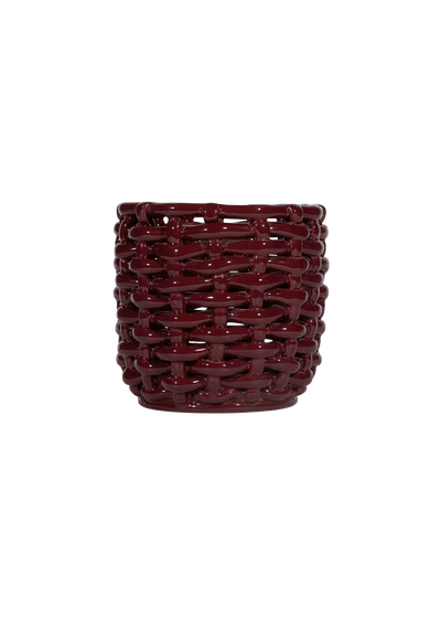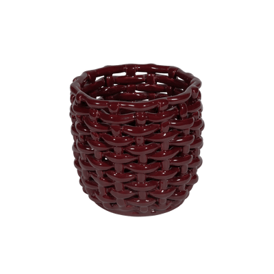 Handwoven burgundy ceramic basketweave pot. Use this glazed planter as a pot for your house plants or as a pot to hold anything around the house, from a kitchen utensils holder to storing paintbrushes or toothbrushes. Upgrade uninspiring plant pots and make your house plants a feature on a table or shelf.