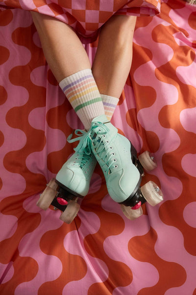 The Dragstrip Disco duvet cover features a fun monochrome wave pattern inspired by natural movement of the ocean (or your best dance moves!🕺) It's designed to be a mix-and-match set with the contrasting Dragstrip Disco pillowcases, featuring a classic checkerboard print, inspired by 70s California car culture.