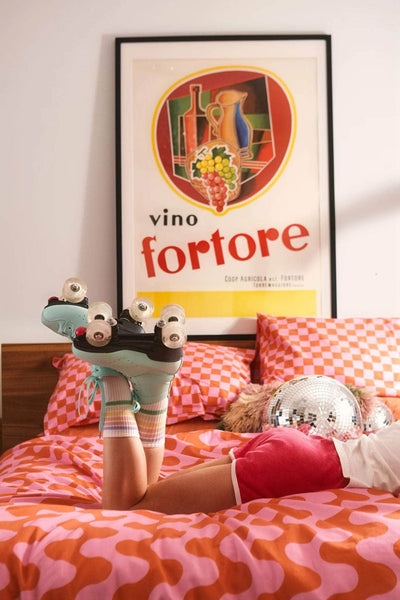 Get ready for disco dreaming with the vibrant sunset hues and fun shapes of our Dragstrip Disco print, available in double and king.