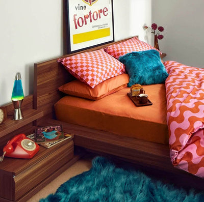 Crafted from 100% organic cotton, their silky satin 300 threadcount weave will keep you cool, while the vibrant print in burnt orange and orchid pink will bring the heat to your positively groovy home ✌️