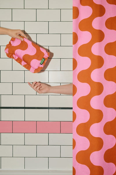 Ignite your inner disco queen with the Dragstrip Disco Ruffle Pouch! This retro-inspired accessory bursts with personality, featuring a dynamic wave print in juicy orange and pink. A playful nod to unforgettable 70s nights, from our original Motel California collection.