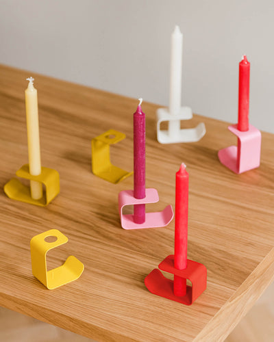 Introducing Flec — a simple candle holder to spice up any desired area of your home. This adorable accessory is made of precisely bent steel, designed to handle the candle steadily. Available in five playful colors and two compatible forms, Flec allows for endless mix & match with numerous shades of candles. Let the cozy candlelight into your interior and make your dining table, living room or bedroom instantly burst with colors!