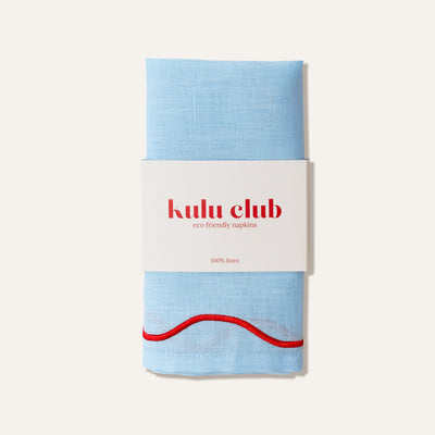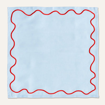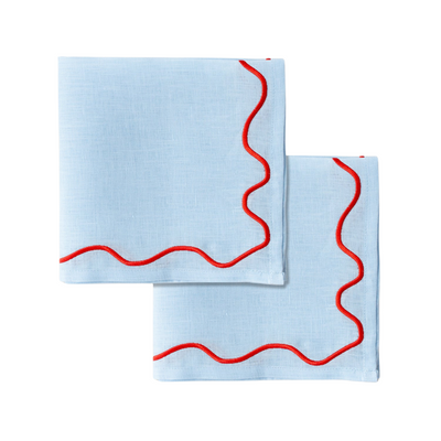 This pair of 100% linen napkins in a soft blue colour, with a playful wavy embroidery in contrasting red, adds a touch of sophistication to the dining table.