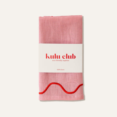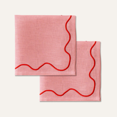 This pair of napkins, made from 100% linen in a beautiful pink shade with playful wavy embroidery in contrasting red, adds a touch of refinement to the dining table.