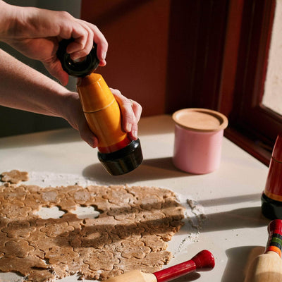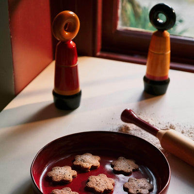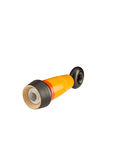 Crafted in Channapatna, India, using traditional wood lathe techniques passed down since the 18th century, the Tipu Pepper Mill demonstrates fine artisanship layered with a contemporary flair. It is designed in collaboration with London based Moe Reddish. The craftsmen of this region are renowned for their intricate, hand-carved, and lacquered children's toys, reflected in the charming design of this kitchen essential.