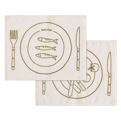 This set of beige placemats comes straight from our imagined Kulu Club bistro. The placemats feature embroidered plates filled with vegetables and sardines in a beautiful green tone — a playful nod to the atmosphere of a cozy French bistro.