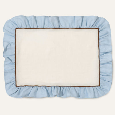This pair of ruffle placemats in an ivory white shade with an ice blue flounce and brown overlock edge is part of our Ruffle collection. The elegant flounce edge gives a playful, romantic touch to every table arrangement, perfect for an inviting and stylish table setting.