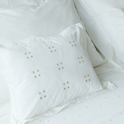 Woven from the highest quality 320-thread-count 100% Egyptian cotton percale, it is hand-embroidered using precise stitching and Ajour pulled thread embroidery to create an intricate geometric design. Available in two sizes.