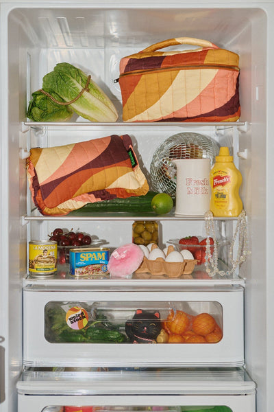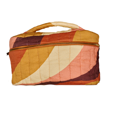 Say hello to your new favourite travel companion or home storage hero! The Sunset Suite Large Organic Cotton Quilted Washbag brings all the joyful, retro-kitsch vibes of a classic 70s sunset to your daily routine. Featuring a wave print in warm mustard, burnt orange, rich brown, and sunny coral, it’s a vibrant splash of retro bliss.