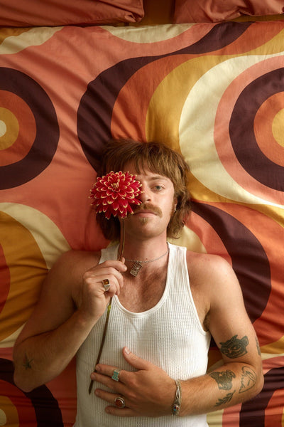 This single size duvet cover is crafted from 100% organic cotton, its silky satin 300 threadcount weave will keep you cool, while the sunset and sand hues will bring the warmth to your 70s sleep sanctuary.