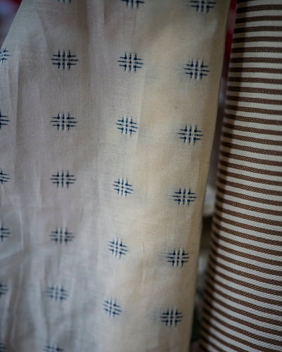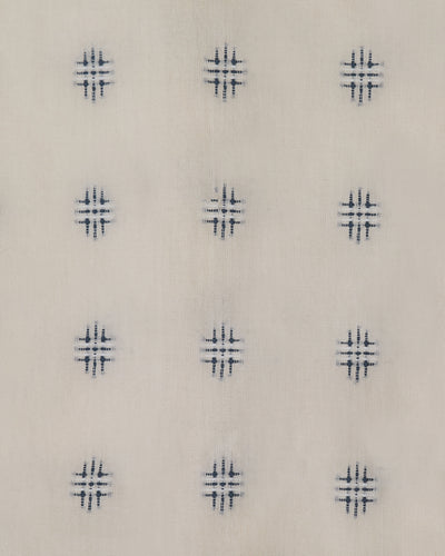 A dark delphinium blue cross-stitch embroidery. Against a backdrop of our creamy lightweight cotton.