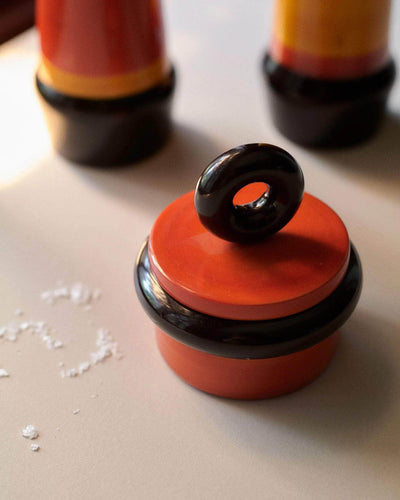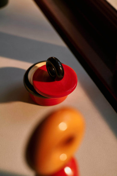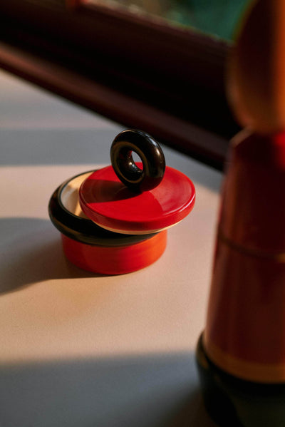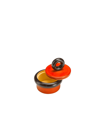 The Pinch Pots are hand-crafted using traditional techniques in the Indian town of Channapatna. The area is known for producing colourful children's toys, evident in the playful form and hues of these pinch pots. Made with locally sourced Hale Maara (ivory wood), each piece is turned on a lathe to achieve the desired form. Lac, a natural resin, is then pressed onto the wood while the heat and friction from the lathe melts the lac, allowing it to adhere beautifully. The glossy orange and yellow finish is derived naturally from turmeric,  Manjista and indigo then polished with screw pine, a locally found fibrous leaf to achieve a glossy finish.