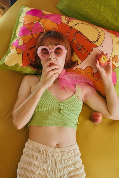 This isn't just any pillowcase; it's a piece of art for your bed. Hand-drawn, retro-inspired dreamscapes are printed in bold, vibrant colours onto luxurious 100% 19-momme mulberry silk.