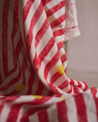 Sunrise fabric. Red vertical stripe with yellow dots. Hand printed and painted in London. Perfect for curtains and soft furnishing. Block printed in Nic’s London studio.