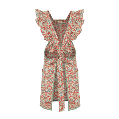 The Full Frill Apron is made from remnant 100% cotton in a pretty floral print with contrasting sage green trim. There are two frilled straps which tie around the back in a bow or around the waist for a more snug fit. The apron has three front pockets for all your essentials.