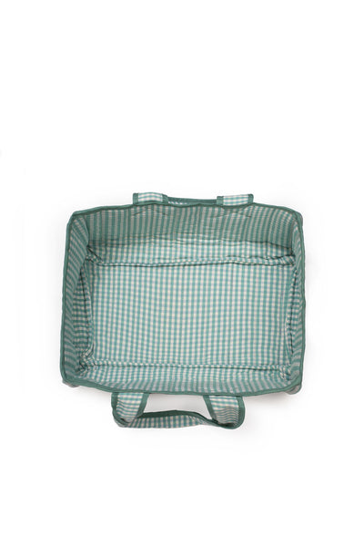 Made from remnant 100% green and white checked Lewis & Wood printed cotton and fully quilted with remnant washed wool.