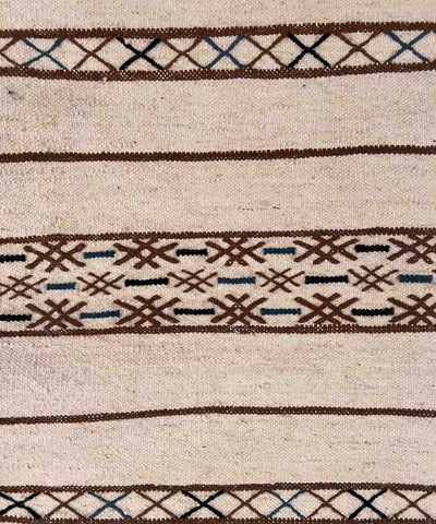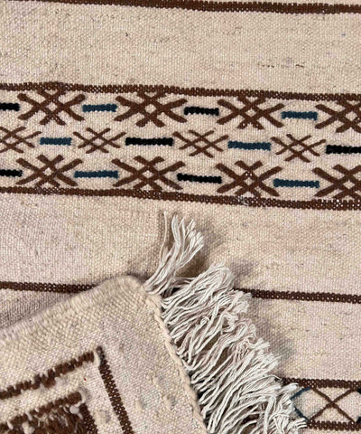 Flat-woven rug from the finest Moroccan Atlas wool and cotton blend by tightly interweaving cotton warp and wool weft strands on traditional vertical looms. An elevated essential, featuring a lighter but robust profile with a rustic feel underfoot, adorned with indigenous Amazigh motifs that bring a sense of calm whilst telling a bigger story.