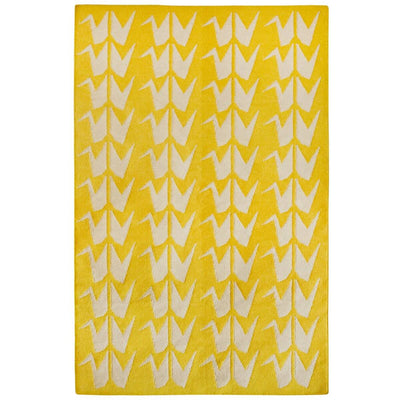 Handwoven by artisans in India from the finest New Zealand wool, this yellow and grey flatweave rug features an origami crane inspired motif.