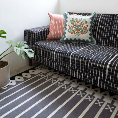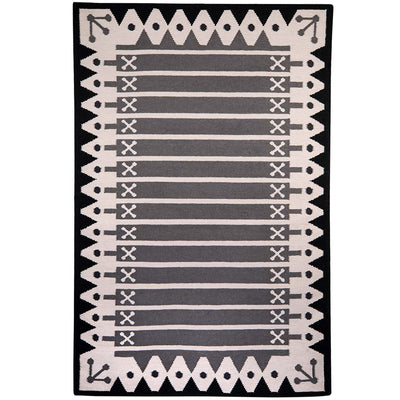A striking black and white flatweave rug handwoven by artisans in India using the finest New Zealand wool.