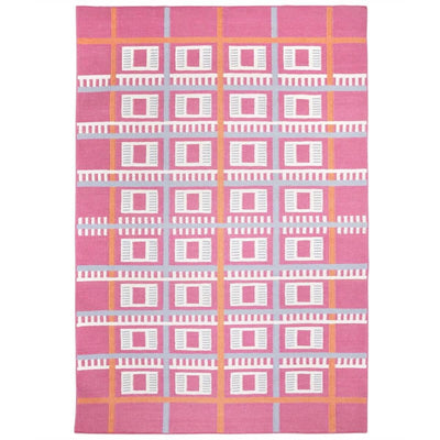 With a checkered design inspired by the architecture of Château de Labourdonnais, Mauritius, this pink flatweave wool rug is handwoven by artisans in India using the finest NZ wool.