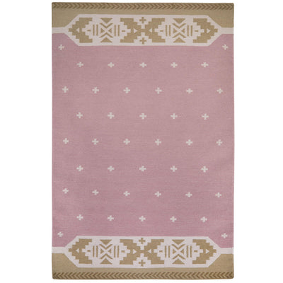 This dusty pink flatweave rug features a versatile design inspired by the geometric woven patterns of Himachali caps.