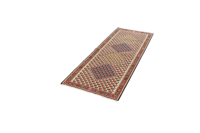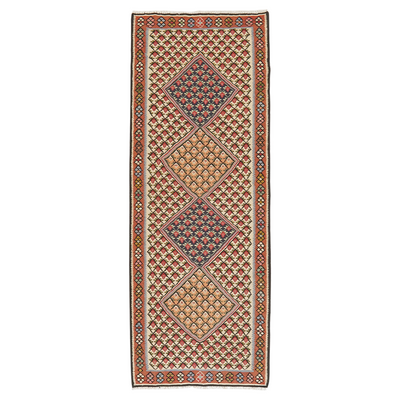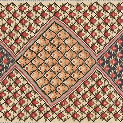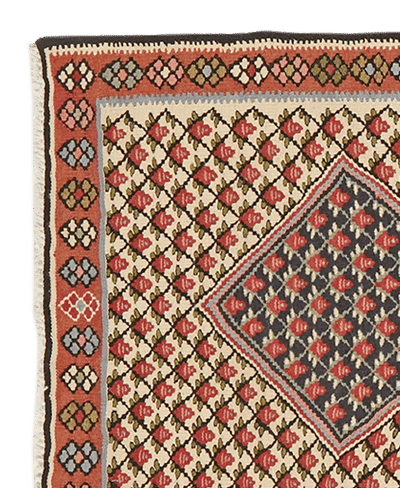 Senneh is the old name of the modern city of Sanandaj. The carpets produced in the city and by nomads or farmers from the surrounding region are known as Senneh rugs. These double-sided kilims are crafted using the traditional slit-weave technique. They often feature small patterns such as bouquets of roses, rows of tree or floral motifs, as well as traditional Mahi designs. Larger central fields are also common, frequently decorated with a rhombus in varying colors.
