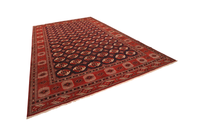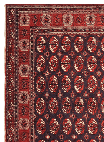 Turkmen rugs originate from the northeast of Iran and are crafted by Turkic-speaking nomads and settled Turkman tribes. Their designs are characterized by linear, repeating patterns of octagonal motifs known as "Gül," which vary from tribe to tribe. While red is the dominant color, these classic nomadic carpets can feature a wide range of color variations.