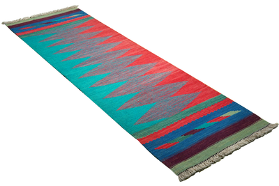 The Gashgai are Turkish-speaking nomadic tribes who live in the region around Shiraz in southwestern Iran. Kilims are reversible, flat-woven wool rugs with a characteristic slit-weave structure, meaning the weft forms slits where the colors change. These rugs feature classic Gashgai motifs such as rhombuses, squares, stripes, and Caucasian star designs. Typical colors include blue, yellow, red, green, and beige.