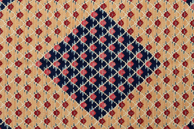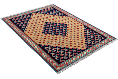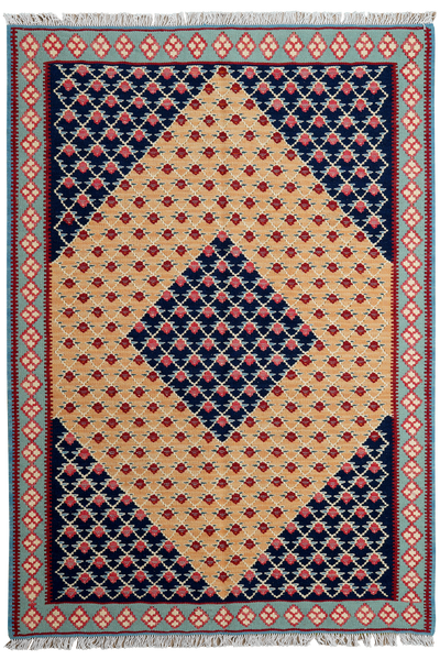 Senneh, the historical name of modern-day Sanandaj, lends its name to the distinctive kilims woven both in the city and by nomadic or rural weavers from the surrounding region. These double-sided kilims are crafted using the traditional slit-weave technique. Characterised by intricate small-scale patterns, typical motifs include rows of floral bouquets, tree and blossom designs, as well as the classic "Mahi" (fish) pattern. A central diamond medallion is often featured, rendered in varied colours to complement the overall composition.