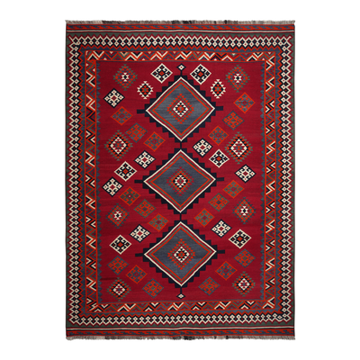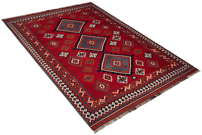 The Gashgai are Turkish-speaking nomadic tribes who live in the region around Shiraz in southwestern Iran. Kilims are reversible, flat-woven wool rugs created with a characteristic slit-weave technique. This means that the weft contains slits at the points where the colors change. These rugs showcase classic Gashgai motifs such as diamonds, squares, stripes, and Caucasian star patterns. A color palette including blue, yellow, red, green, and beige is commonly used.