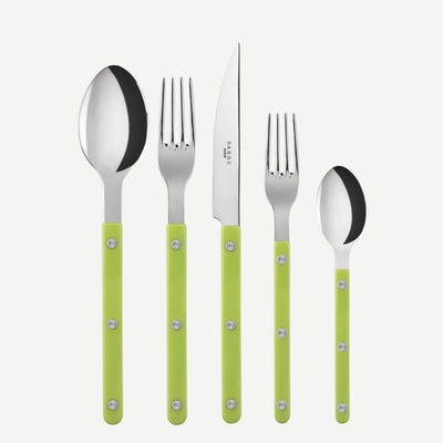 With the Bistrot collection, Sabre were inspired by some of their favourite places: restaurants, terraces and cafés. When designing this cutlery they wanted to faithfully capture the atmosphere while adding a modern touch: the styling is simple, the rivets are visible, while the colours and materials stand out nicely. From red to blue, not forgetting the superb materials with horn or tortoise effects. Available with gloss or vintage finishes, we’re sure you’ll enjoy this collection, which is designed to be both traditional and contemporary at the same time. This 5-piece Sabre set includes a soup spoon, a dinner fork, a dinner knife, a teaspoon and a salad fork, simply perfect for enjoying a dessert or starter. This 5-piece set offers the perfect combination for your daily meals.