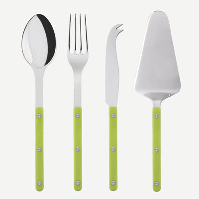 With the Bistrot collection, Sabre were inspired by some of their favourite places: restaurants, terraces and cafés. When designing this cutlery they wanted to faithfully capture the atmosphere while adding a modern touch: the styling is simple, the rivets are visible, while the colours and materials stand out nicely. From red to blue, not forgetting the superb materials with horn or tortoise effects. Available with gloss or vintage finishes, we’re sure you’ll enjoy this collection, which is designed to be both traditional and contemporary at the same time. This Bistrot set is composed of 4 must-have serving pieces for all your daily meals. It includes serving cutlery (fork and spoon), a large cheese knife and a cutting pie server to serve all your dishes. This set is the essential complement to your cutlery!