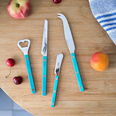 With the Bistrot collection, Sabre were inspired by some of their favourite places: restaurants, terraces and cafés. When designing this cutlery they wanted to faithfully capture the atmosphere while adding a modern touch: the styling is simple, the rivets are visible, while the colours and materials stand out nicely. From red to blue, not forgetting the superb materials with horn or tortoise effects. Available with gloss or vintage finishes, we’re sure you’ll enjoy this collection, which is designed to be both traditional and contemporary at the same time. To gift or to treat yourself, this 4-piece aperitif cutlery set contains the essential cutlery for this convivial moment. Consisting of a bottle opener, a tomato knife, a small cheese knife and a spreader, it's a great idea for a gift!