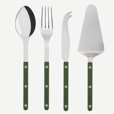 With the Bistrot collection, Sabre were inspired by some of their favourite places: restaurants, terraces and cafés. When designing this cutlery they wanted to faithfully capture the atmosphere while adding a modern touch: the styling is simple, the rivets are visible, while the colours and materials stand out nicely. From red to blue, not forgetting the superb materials with horn or tortoise effects. Available with gloss or vintage finishes, we’re sure you’ll enjoy this collection, which is designed to be both traditional and contemporary at the same time. This Bistrot set is composed of 4 must-have serving pieces for all your daily meals. It includes serving cutlery (fork and spoon), a large cheese knife and a cutting pie server to serve all your dishes. This set is the essential complement to your cutlery!