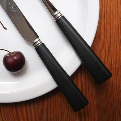 This collection is dishwasher safe at 45° maximum. Remember to open the dishwasher at the end of the cycle. When washing by hand, we recommend that you do not use abrasive sponges. If small rings appear on the knife blades, they can be easily removed with a soft cloth and/or white vinegar. For cutlery with light-coloured handles, avoid prolonged contact with foods that stain (coffee, tea, tomato sauce, etc.).