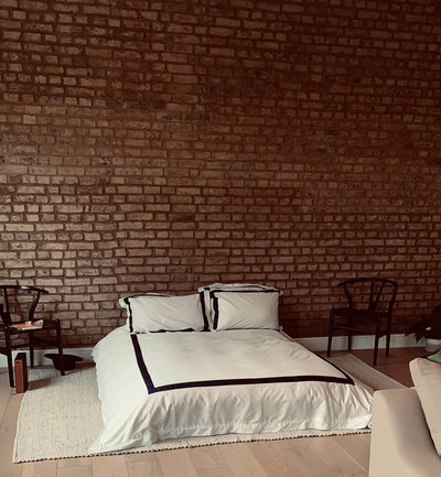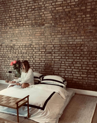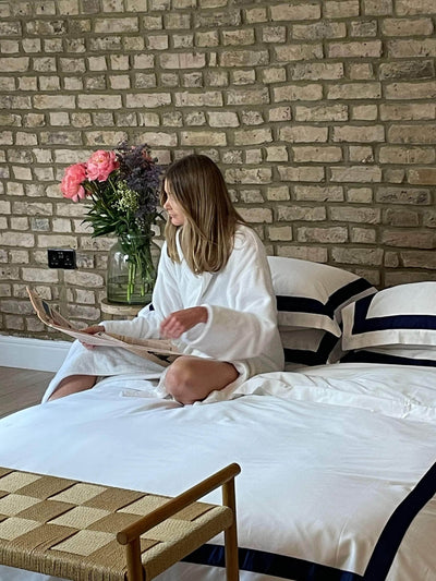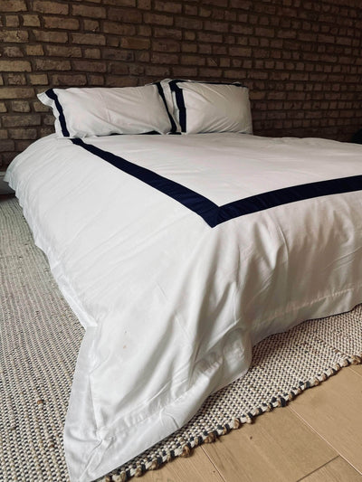 The duvet cover and pillow cases feature a rich Navy border along all sides. Sustainably and ethically made of surplus factory fabric in 400 thread count cotton with a luxe sateen finish giving it a buttery soft feel and an ever so slight glow.