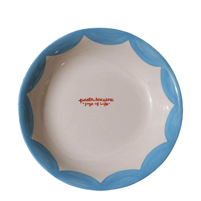 This ceramic pasta bowl is perfect for family dinners and parties. Its hand-painted design features the three "joys of life" - pasta, sex and wine.