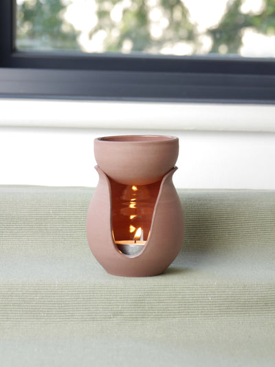 Wheel thrown in ‘damon’ clay, this burner is unique in texture and character. The interior gloss glaze reflects the flickering light of the candle.