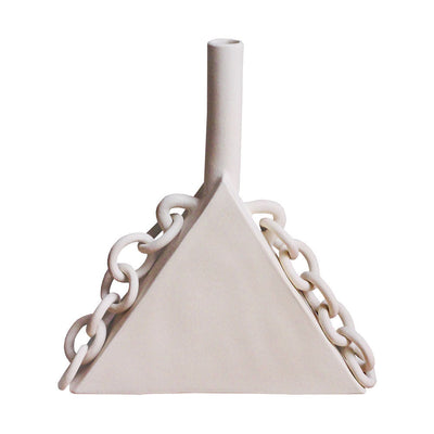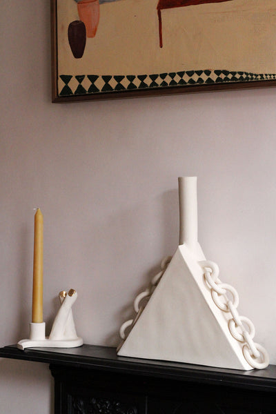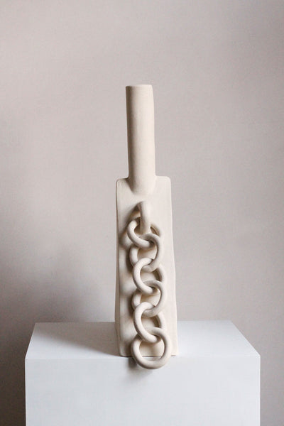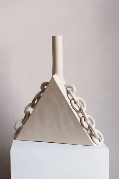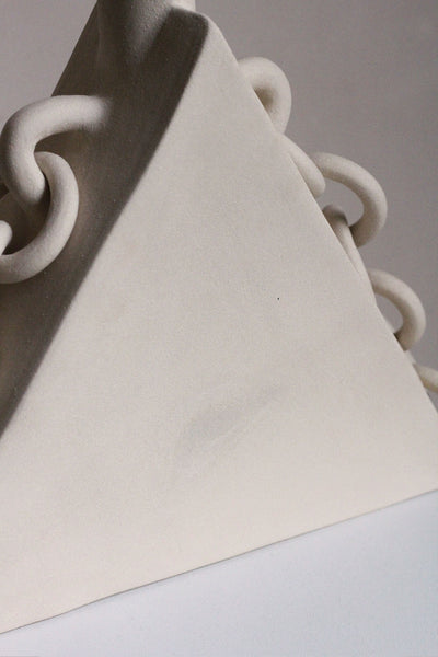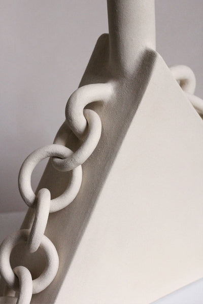 Formed from white stoneware, this sculpture features chain linked motifs to represent unity and connection. These hopeful sentiments are integral today in a world that feels ever more divided and disconnected. The striking yet simple chain hangs from the triangular body of the sculpture, adorning the form like jewellery, the links connecting to one another and the main body of the piece.