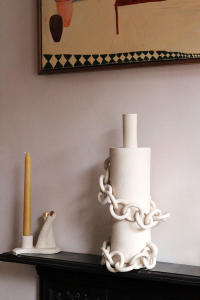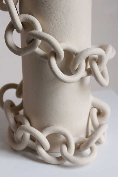Formed from white stoneware, this sculpture features a chain linked motif to represent unity and connection. These hopeful sentiments are integral today in a world that feels ever more divided and disconnected. The striking yet simple chains spiral around the sculpture, connecting themselves to one another and the main body of the piece.